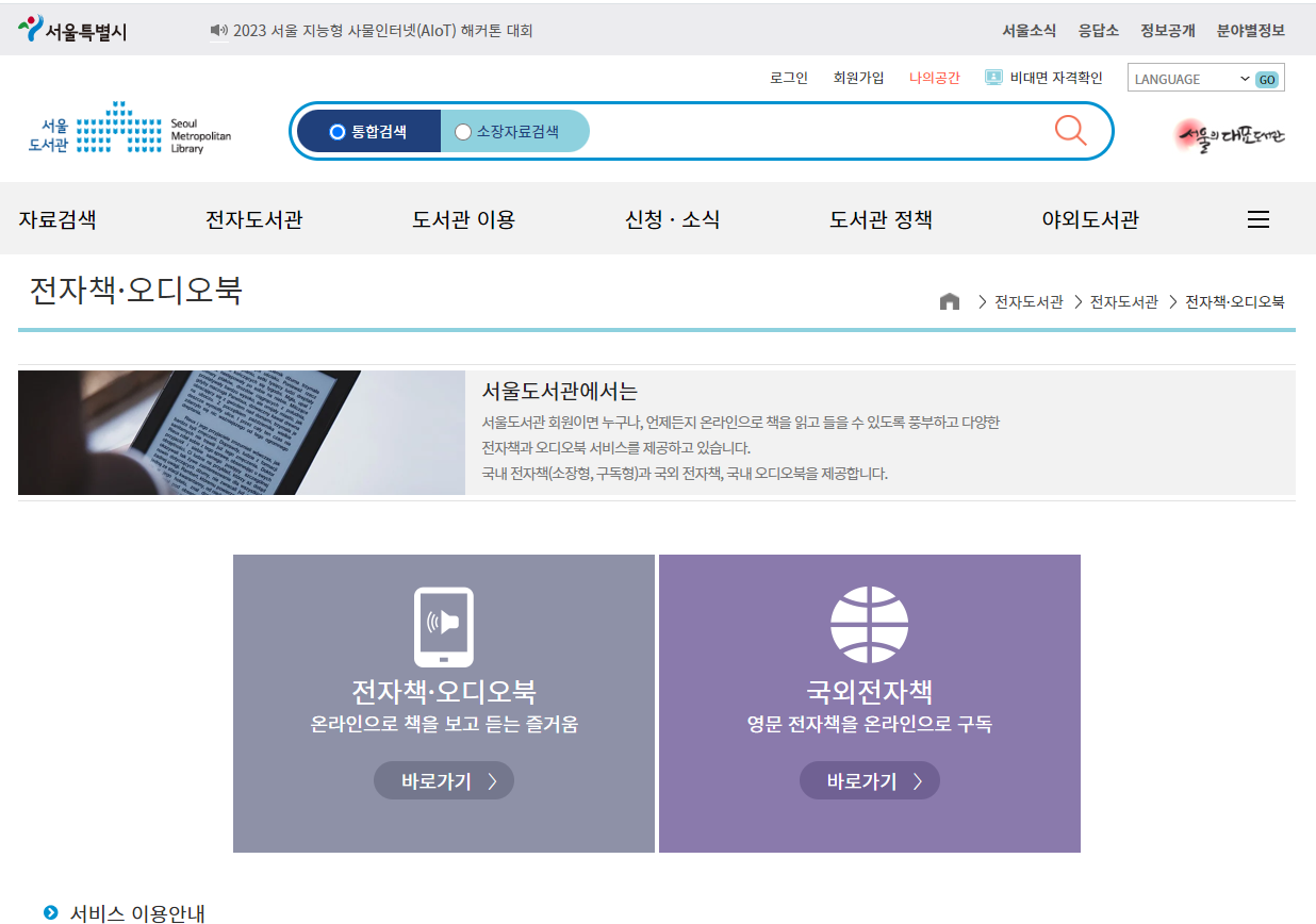 서울시에서는 다양한 전자책 서비스를 운영하고 있습니다. 이러한 서비스를 모두 편리하게 검색하고 이용할 수 있는 통합 검색 사이트도 있지만, 각 서비스의 정책이 다르기 때문에 검색 결과를 클릭하면 해당 웹사이트로 다시 안내되는 형태입니다. 이로 인해 검색 속도나 과정에서 약간의 불편함을 느낄 수 있습니다.