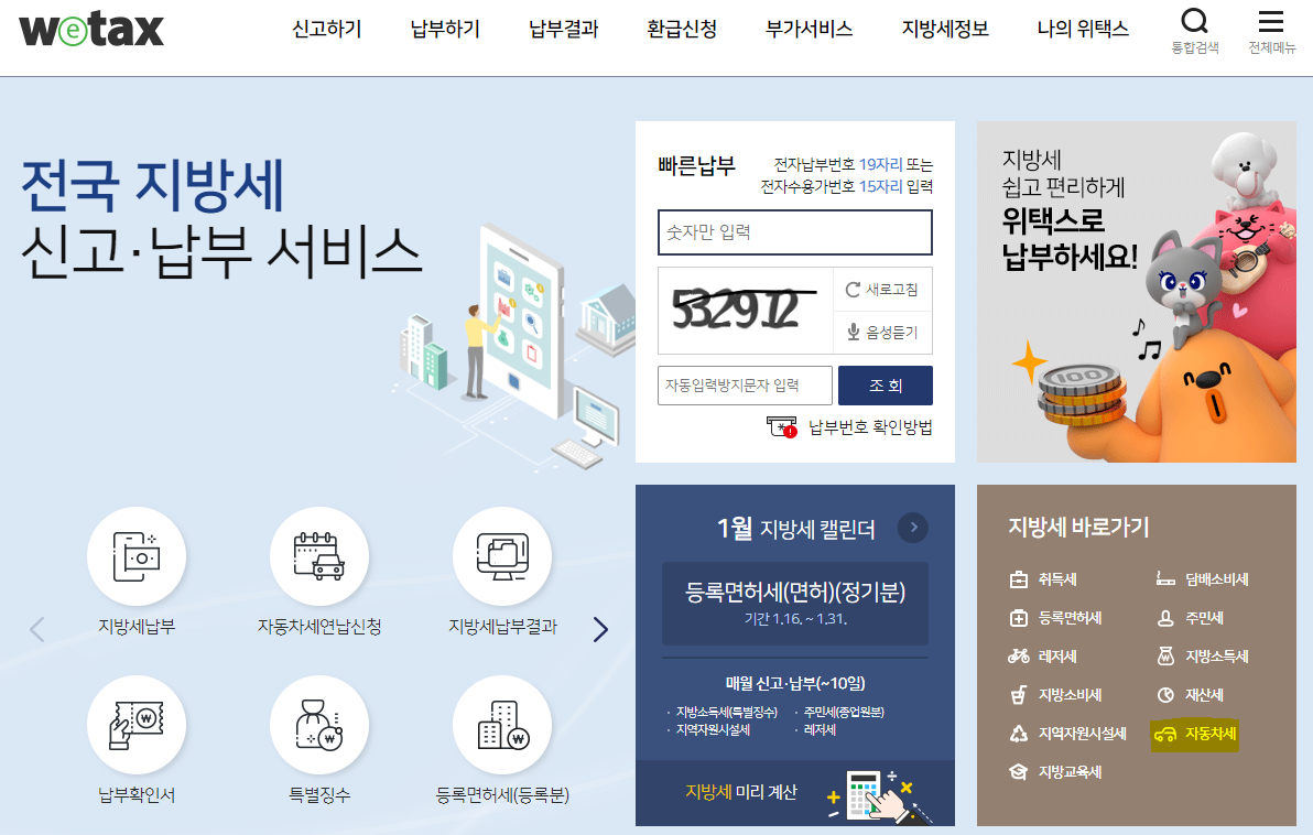 2. WETAX 홈페이지에 들어가서 화면 오른쪽 하부에 자동차세를 클릭합니다.